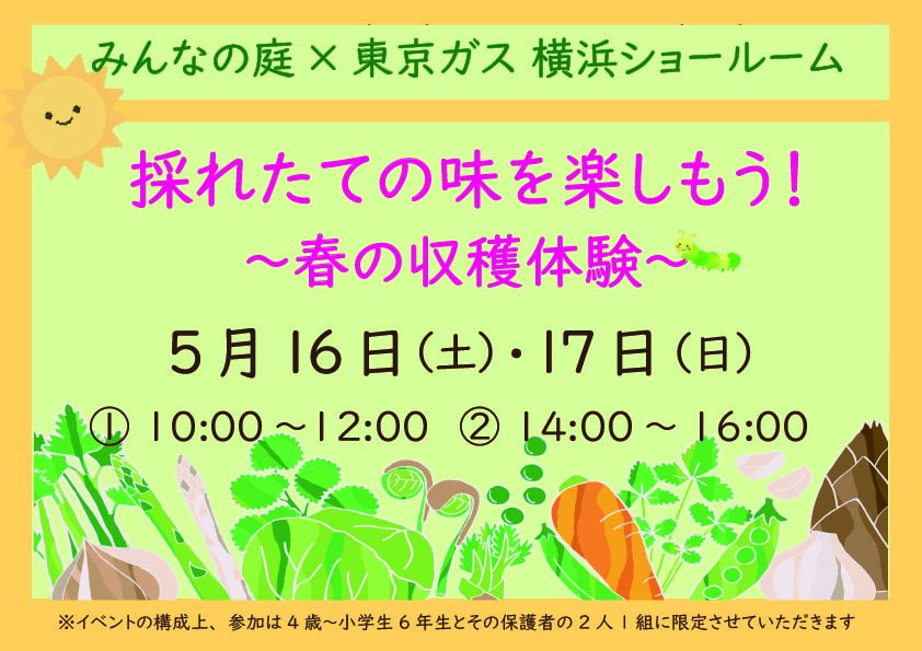 みんなの庭×東京ガス横浜ショールームコラボ企画 「採れたての味を楽しもう!~春の収穫体験~」
